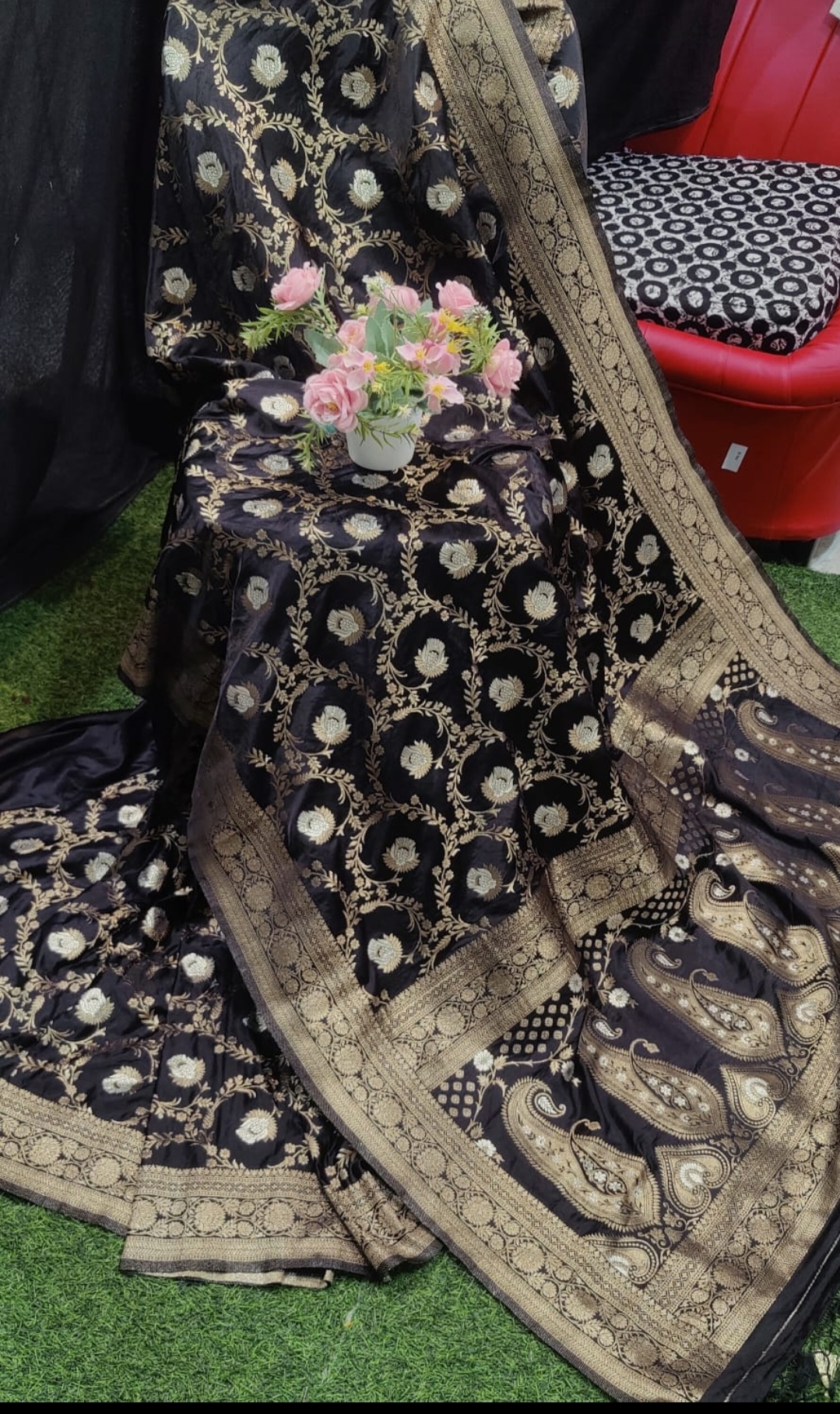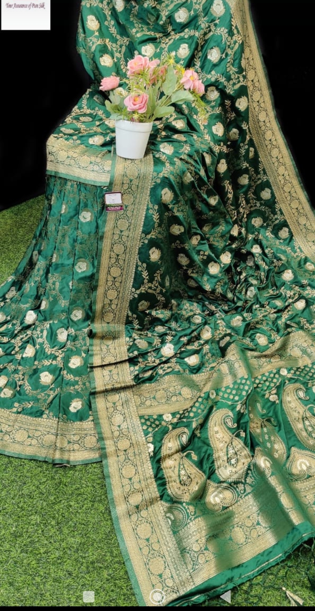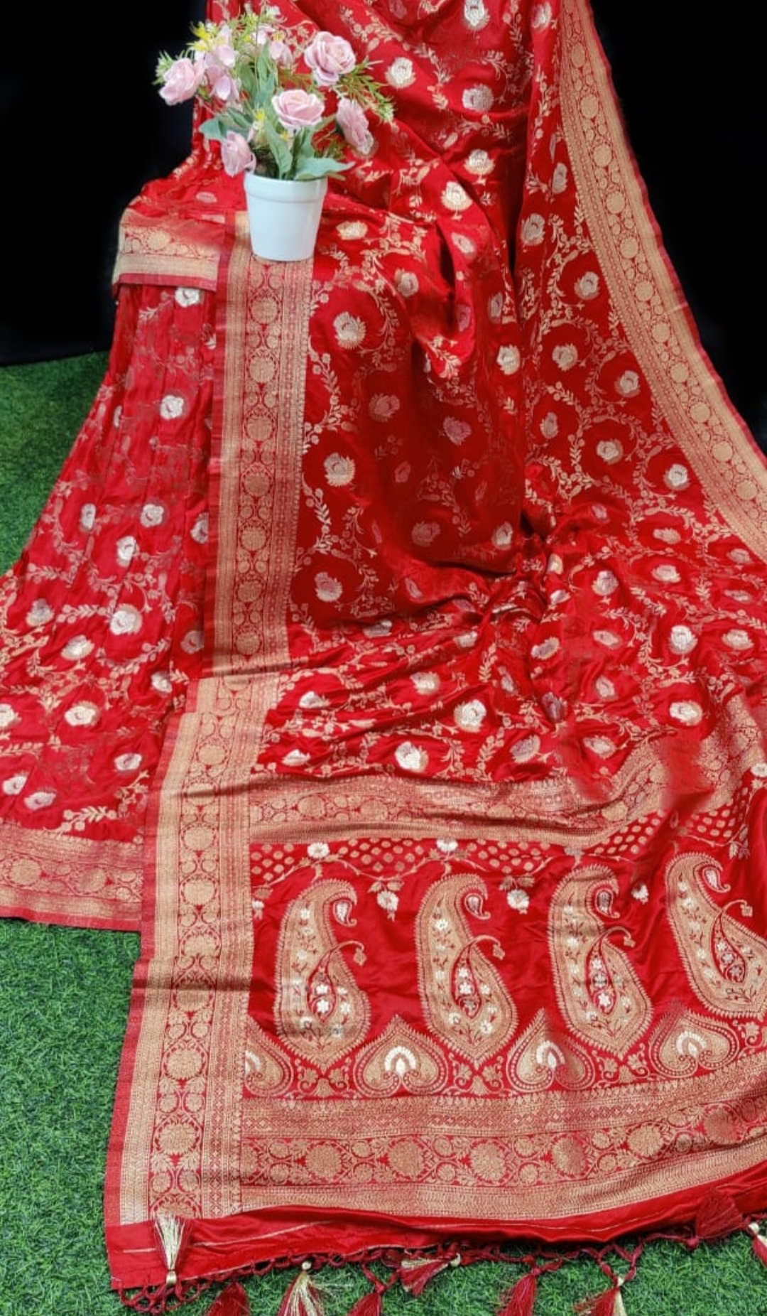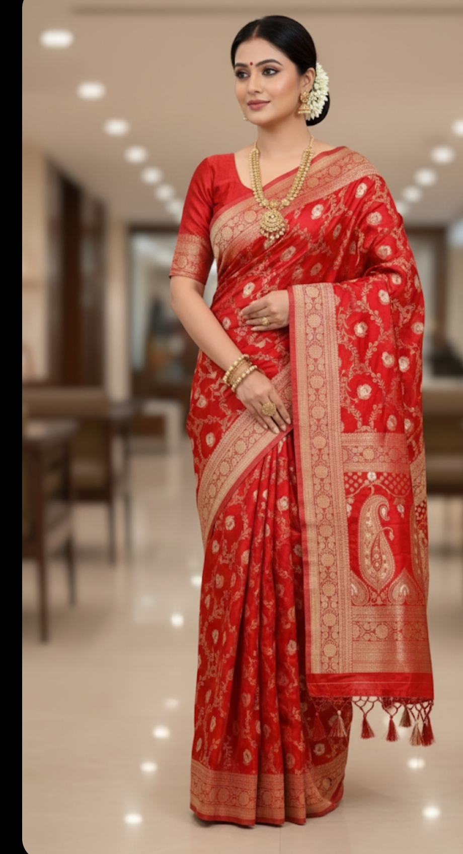 Gaji Banarasi Saree – A regal Red saree crafted in luxurious Gaji silk, adorned with exquisite golden zari weaving that showcases elegant floral and vine motifs across the body. The saree features a richly detailed Banarasi border with traditional patterns, adding depth and grandeur to its overall look. The pallu is beautifully highlighted with intricate paisley and classic zari designs, reflecting the timeless artistry of Banaras weaving. With its glossy texture, rich contrast, and opulent finish, this saree is a perfect choice for weddings, festive celebrations, and grand occasions, offering a graceful blend of tradition and sophistication