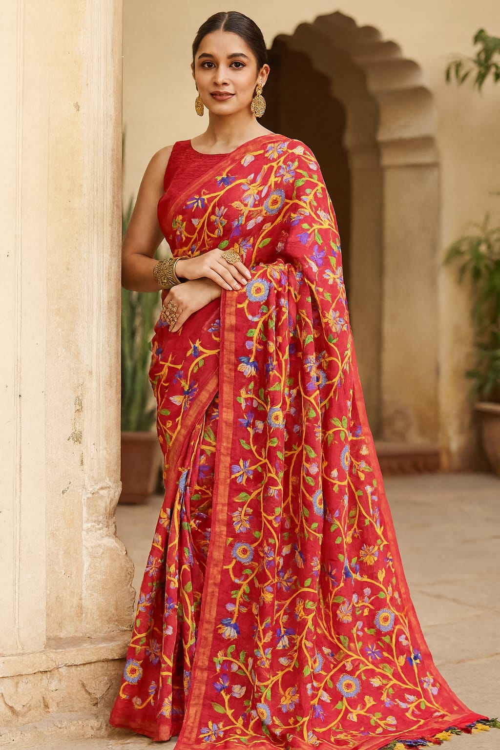 The authentic Bonolata style rich, elegant shades that Enhance every skin tone. soft on skin with Kashmiri Stich perfect for all day comfort. Matching woven blouse piece included. Handloom finish, traditional Art, all season wear .