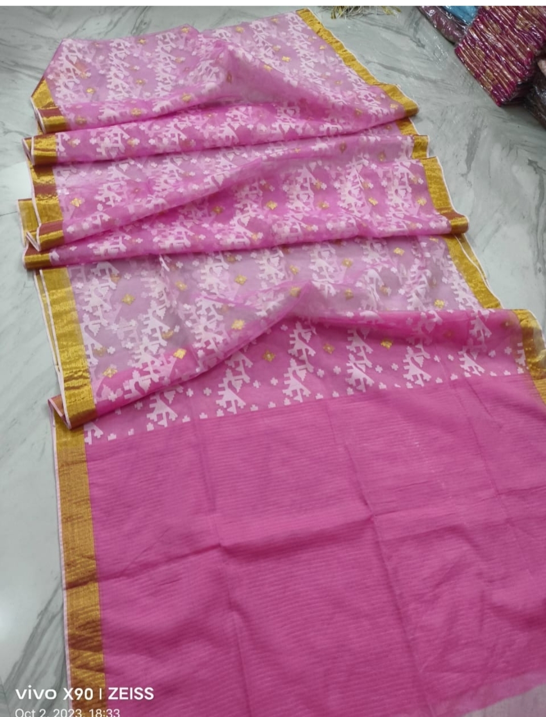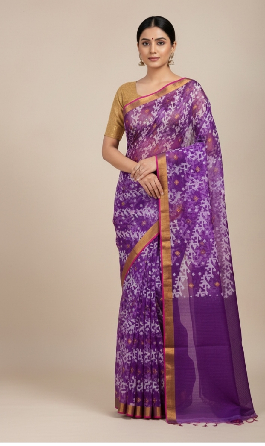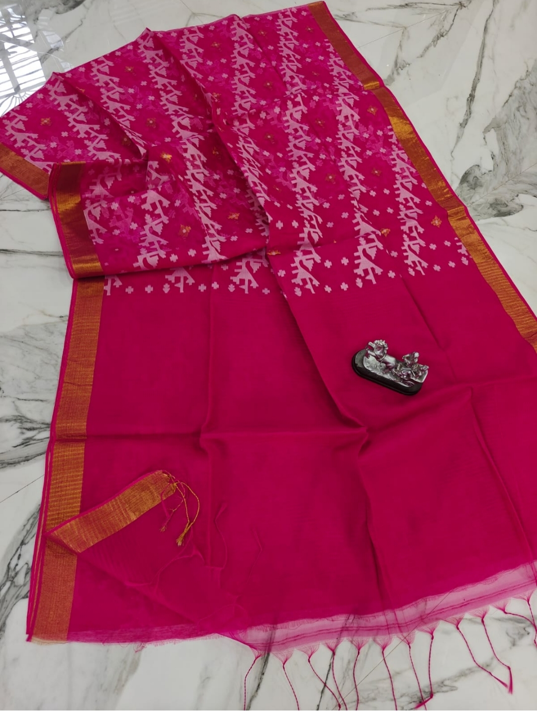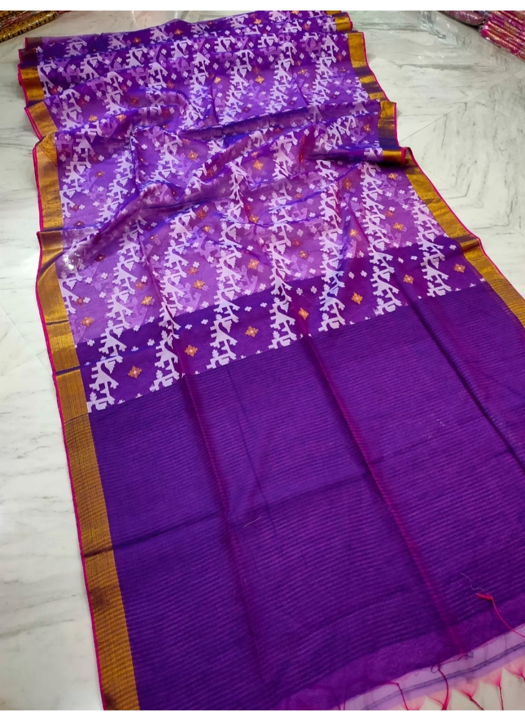 Maslin Jamdani Saree – A stunning vibrant Purple saree crafted in soft Maslin fabric, beautifully adorned with intricate white Jamdani woven motifs running across the body. The saree is highlighted with a rich golden zari border that adds a touch of traditional elegance. Finished with delicate tassels at the pallu, this saree blends classic craftsmanship with a graceful, festive appeal, perfect for special occasions and celebrations.