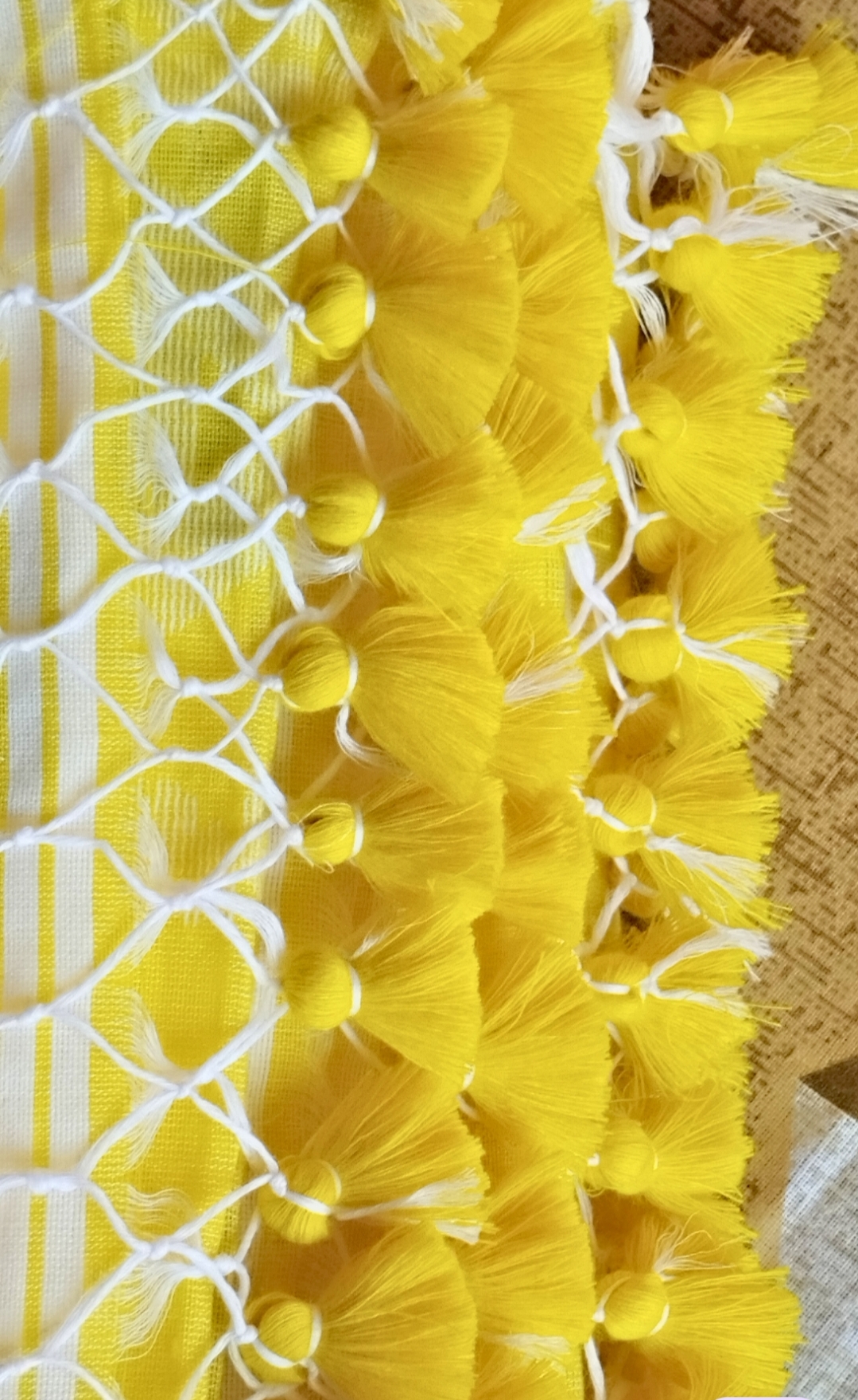 This Beautiful yellow handloom saree features soft, breathable fabric and a vibrant traditional look. The saree is adorned with subtle ikat-inspired motifs in white and green, giving it an elegant yet refreshing appeal. This saree combines comfort with classic aesthetics. Perfect for everyday wear, festive occasions, or office styling .